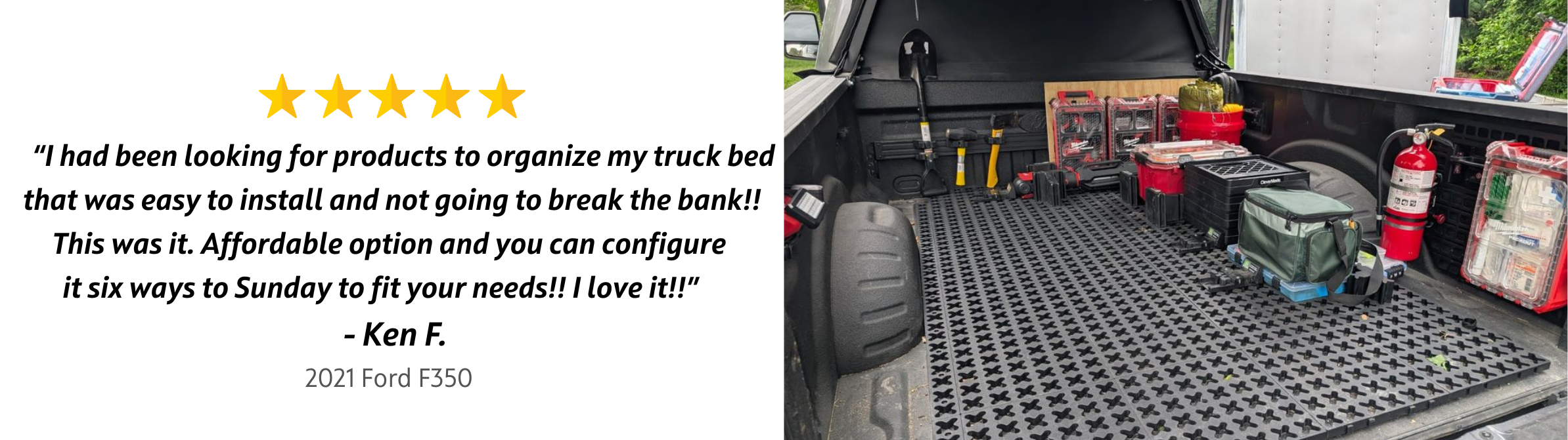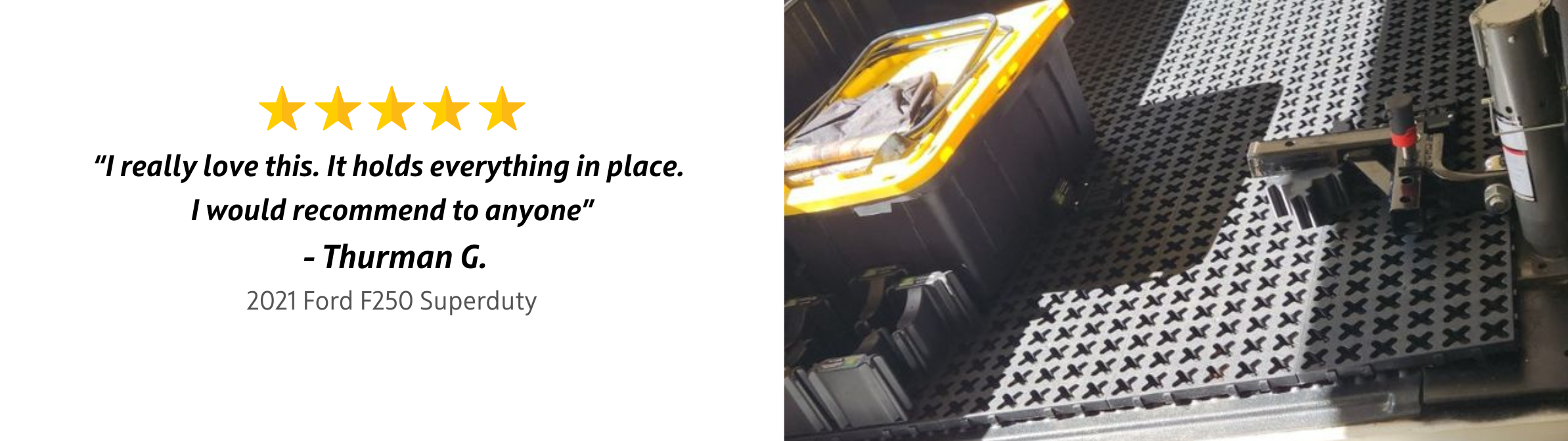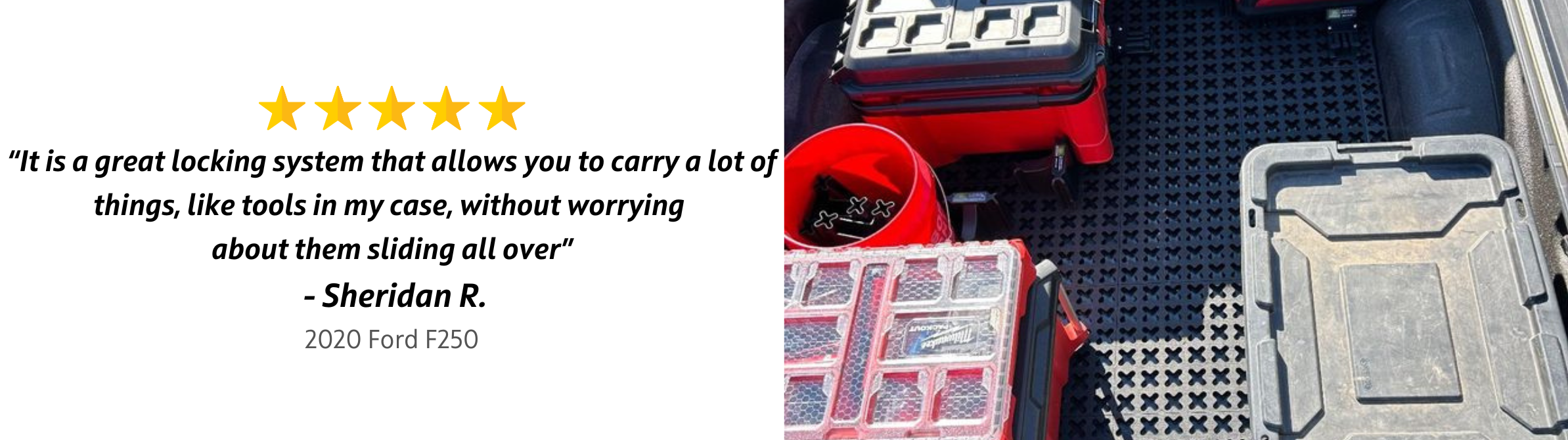 Improve your Ford F-250’s truck bed organization with this cargo management system. Adjustable blockers insert into the mat in any pattern you choose, creating compartments for tools, gear, and equipment. Built to fit between the wheel wells, it slides toward the tailgate for fast, convenient access. Compatible with drawer systems, bed slides, and other custom setups.