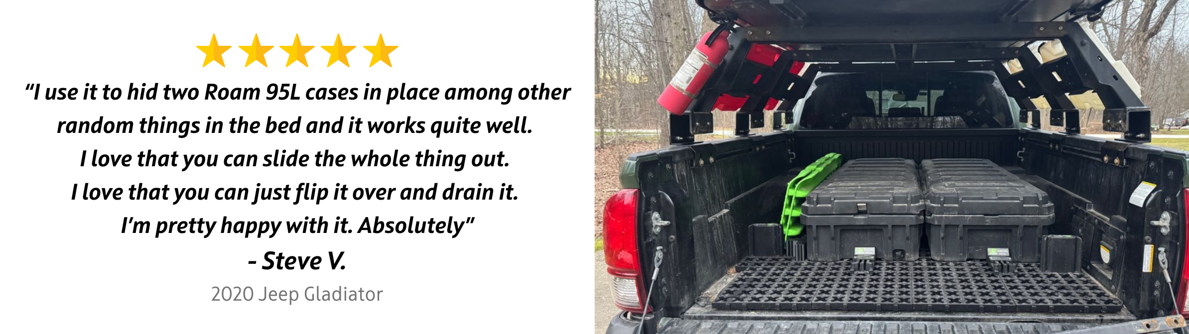 Set up your Jeep Gladiator for better truck bed organization with this cargo management system. Adjustable blockers plug into the mat in any arrangement, creating compartments for tools, gear, and equipment. The system fits between the wheel wells and slides toward the tailgate for quick access to your cargo. Works with drawer systems, bed slides, and other custom setups.