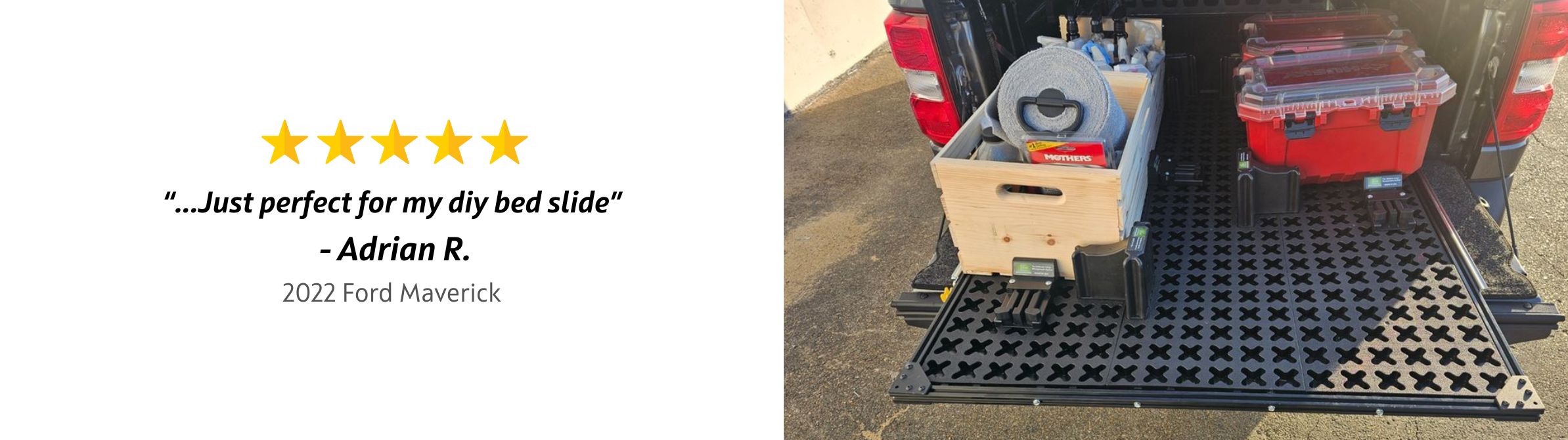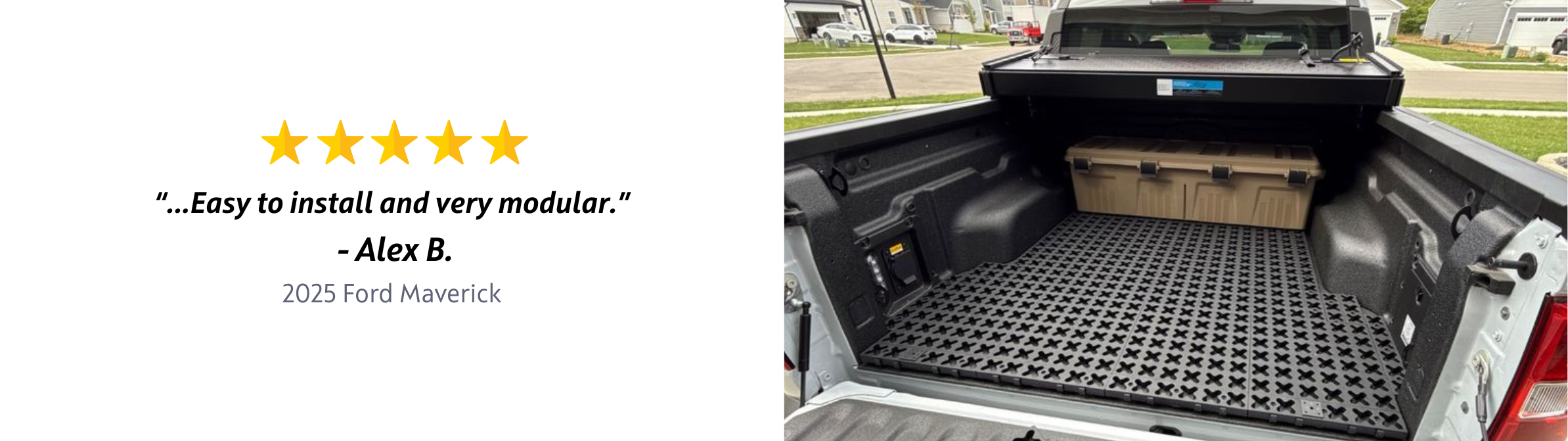 Equip your Ford Maverick with a cargo management system designed for practical truck bed organization. Adjustable blockers fit into the mat in any arrangement, letting you create compartments for tools, gear, and equipment. The system sits between the wheel wells and slides out to the tailgate for fast access. Compatible with drawer systems, bed slides, and other custom setups.