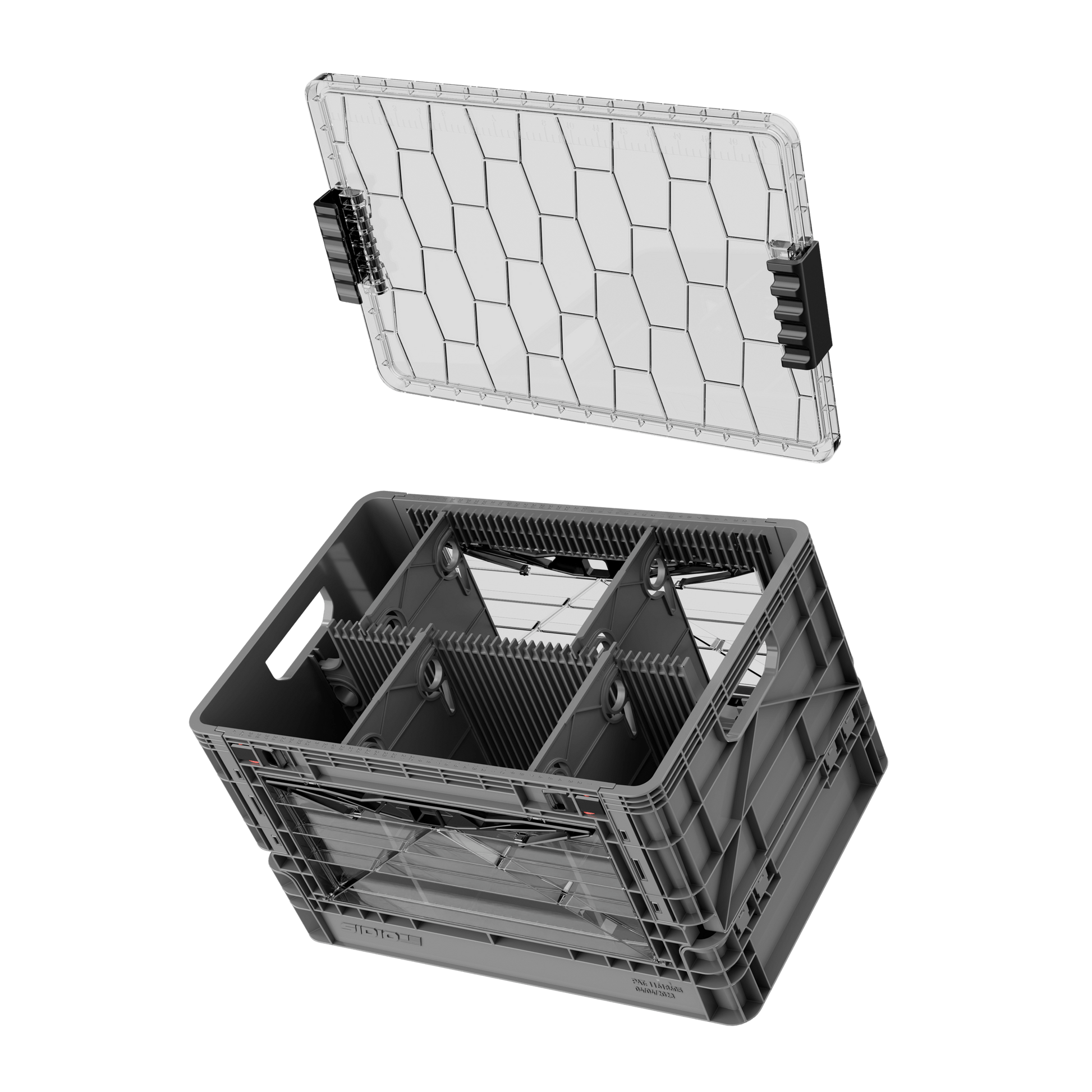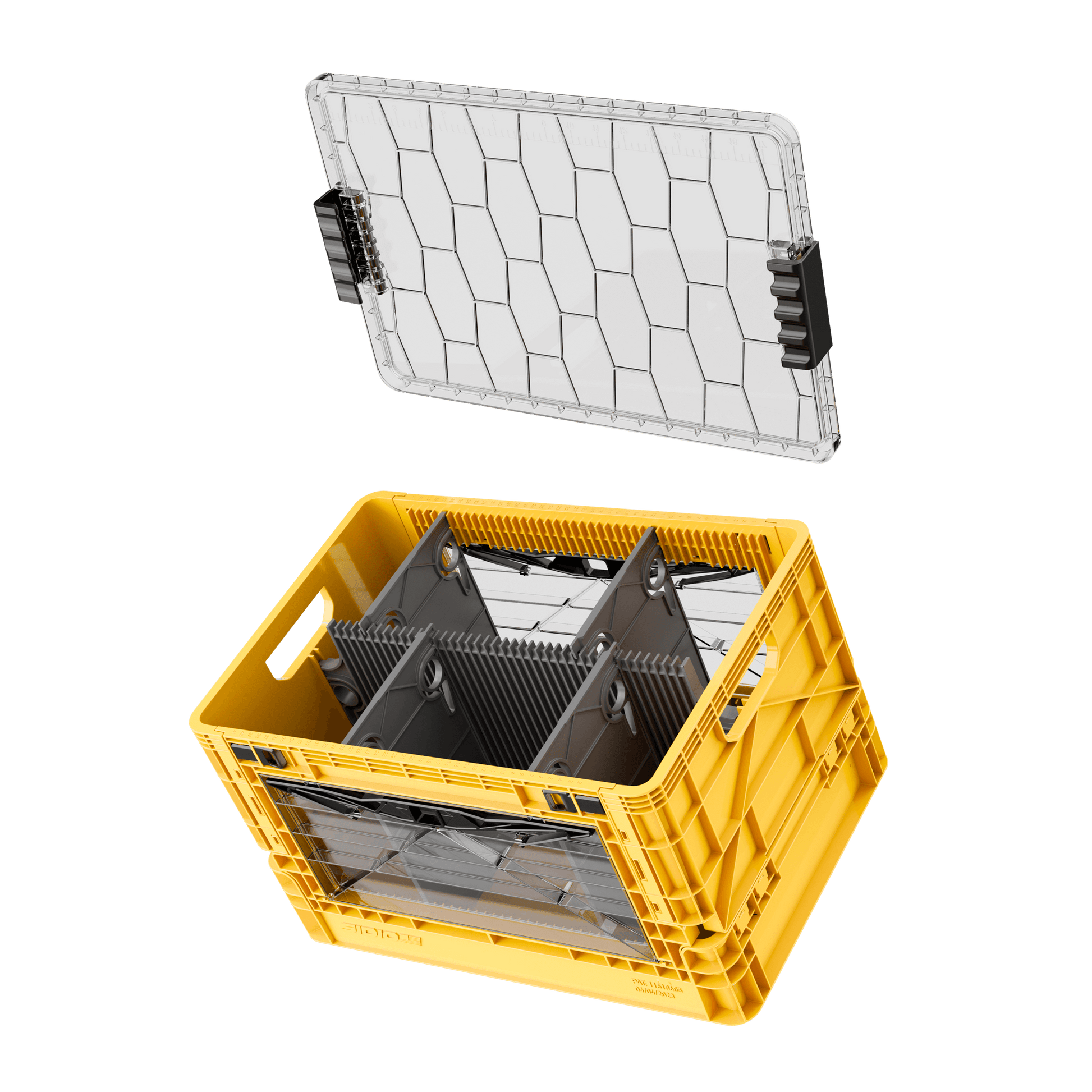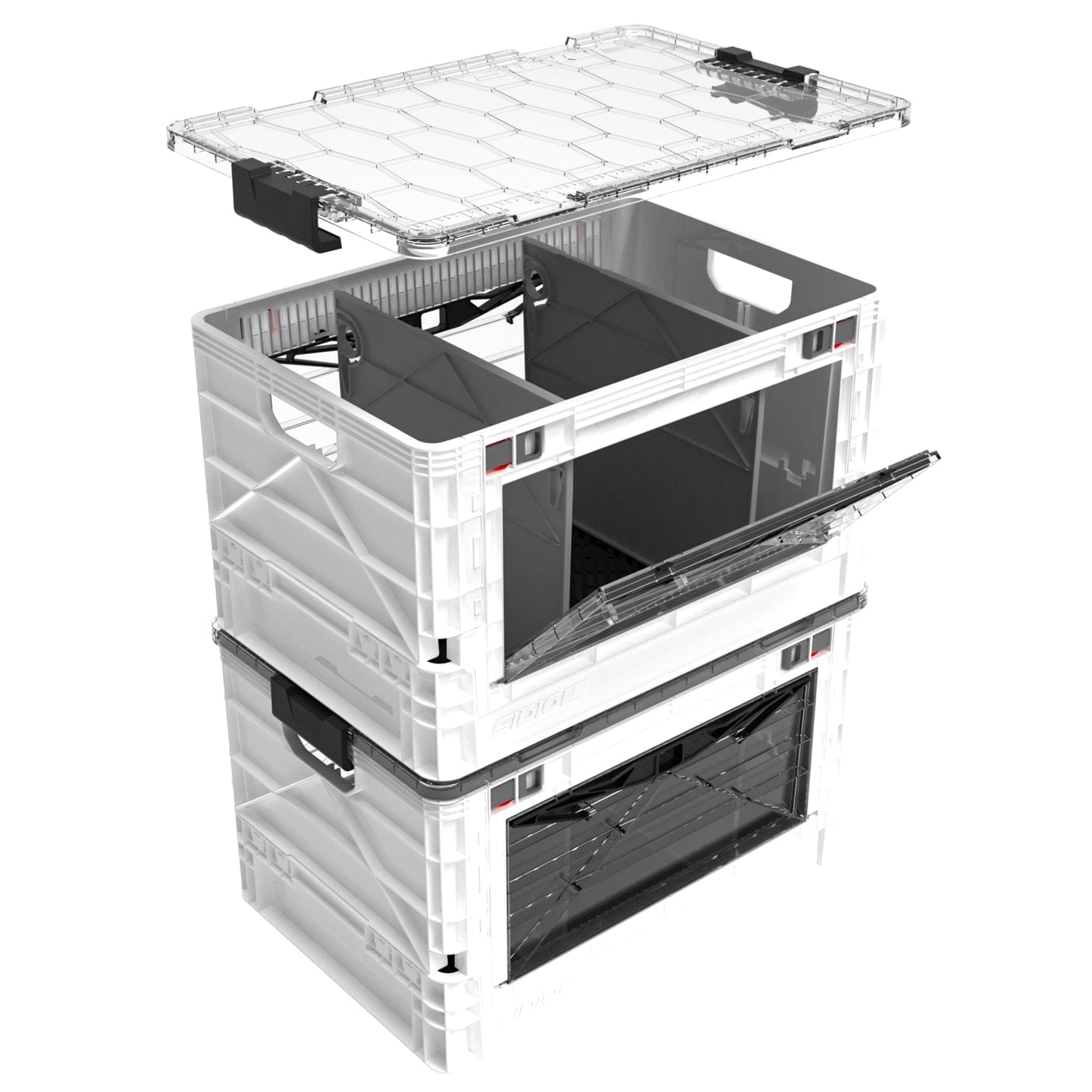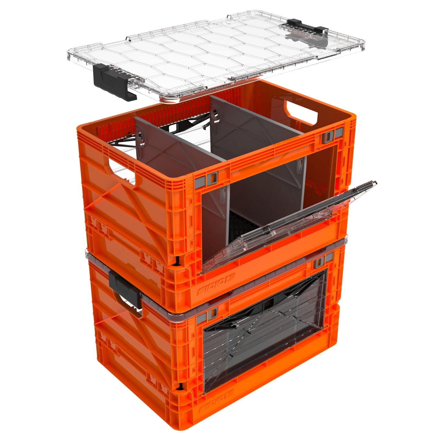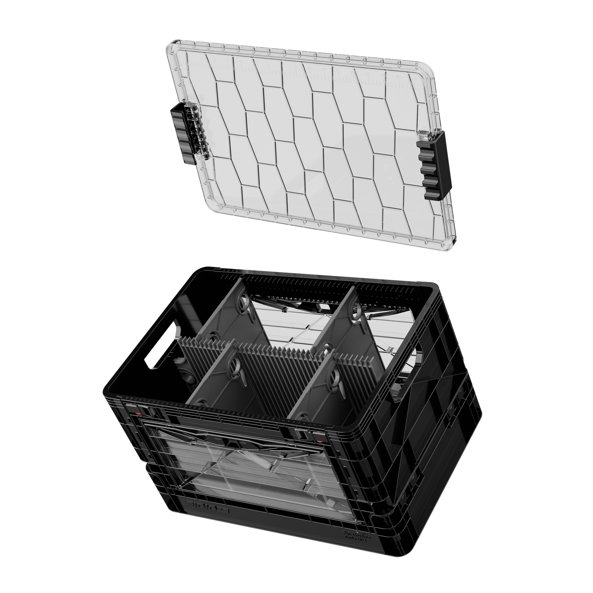 Designed for maximum efficiency and durability, the Full Size Collapsible SidioCrate offers superior storage flexibility. With its collapsible design, reinforced structure capable of supporting over 200lbs, and 41 divider slots, this crate is built for heavy-duty use. The side access window allows for quick retrieval, and it stacks securely with or without the lid, whether collapsed or in use. Made from durable polypropylene block copolymer, it resists cracks, dents, and extreme temperatures, ensuring long-lasting performance. Perfectly stackable with standard 24qt milk crates, it’s the ultimate storage solution for any environment.