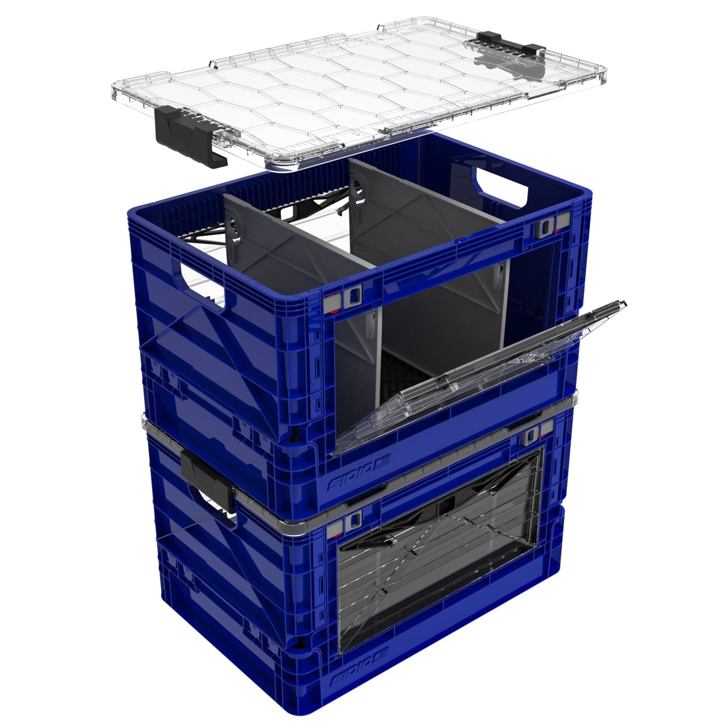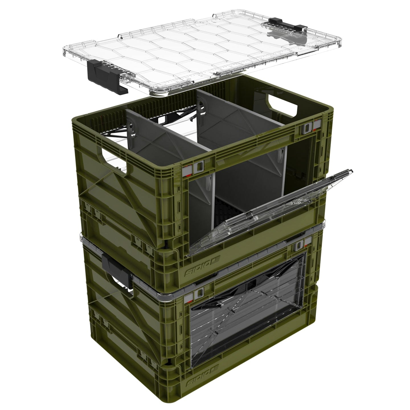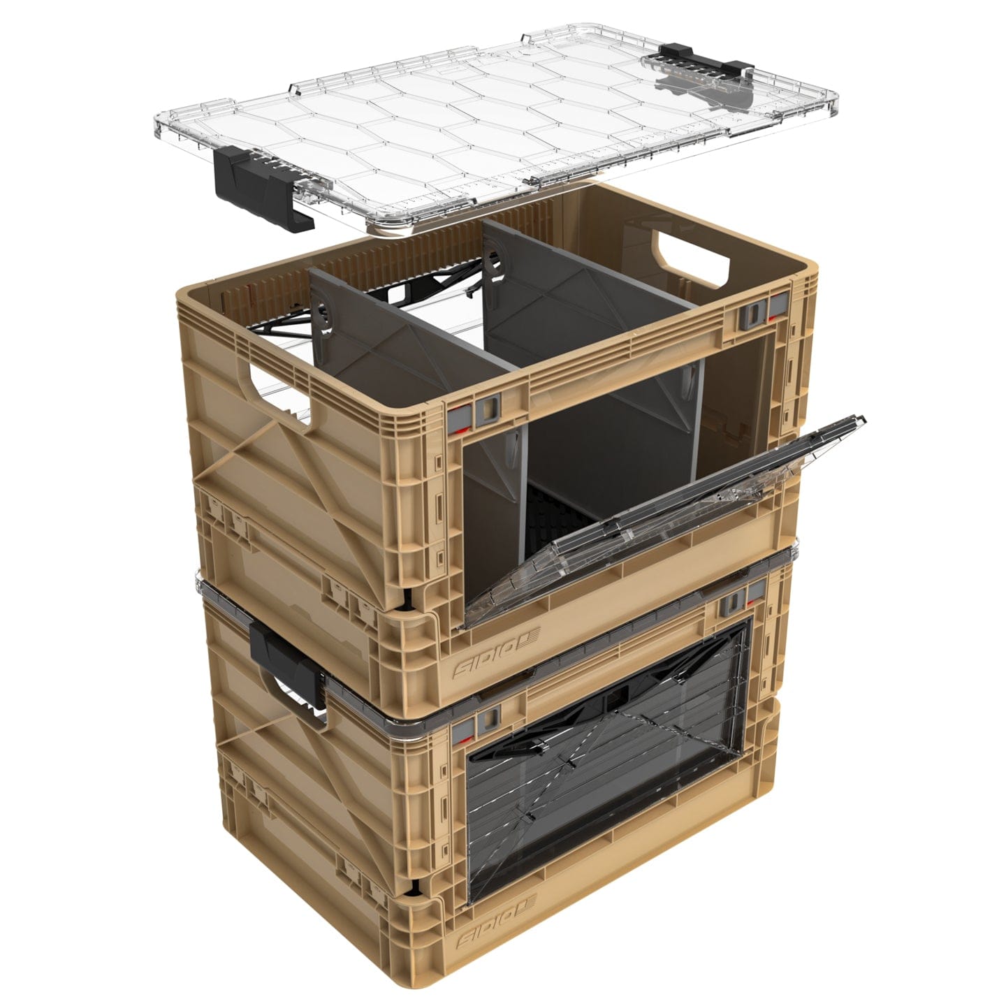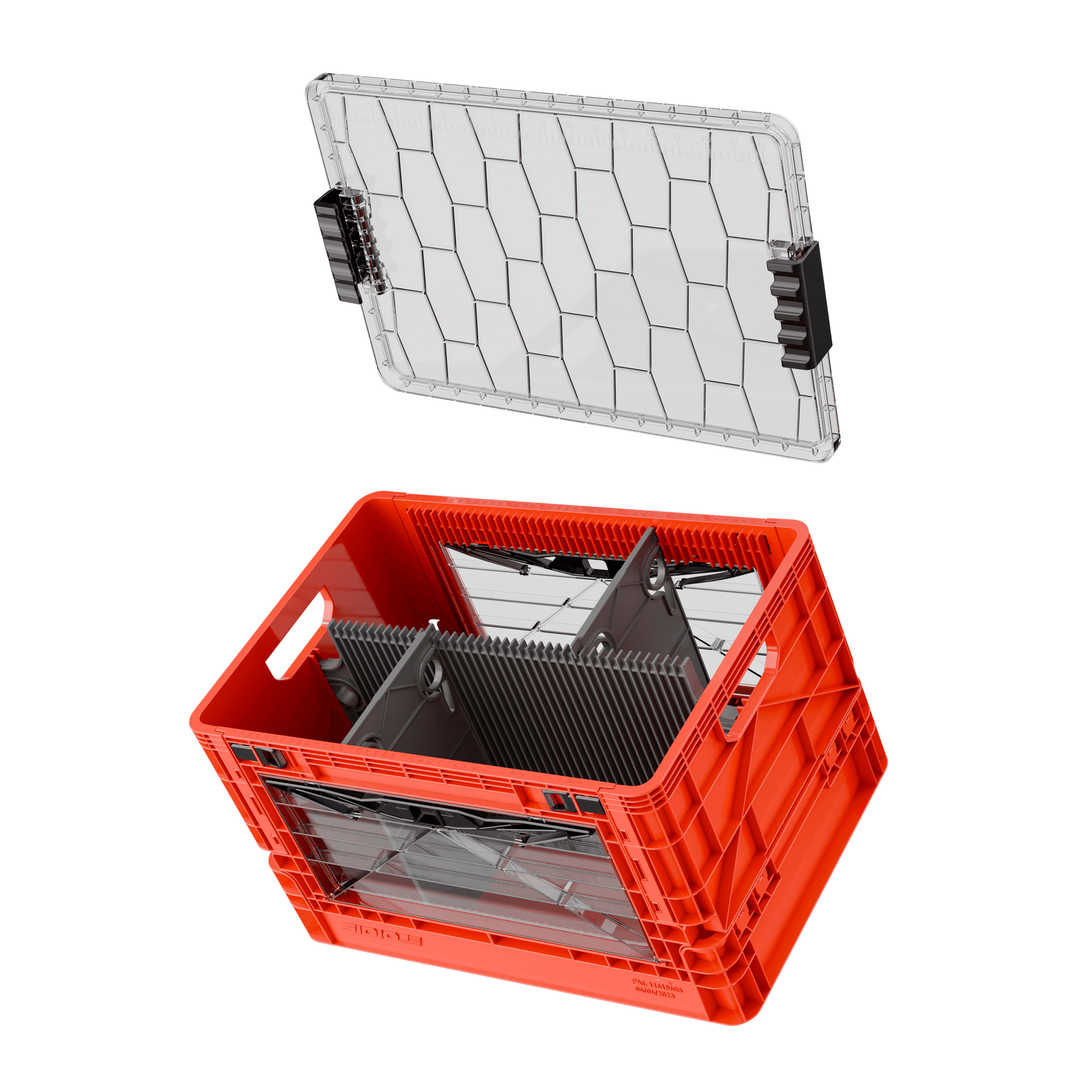Designed for maximum efficiency and durability, the Full Size Collapsible SidioCrate offers superior storage flexibility. With its collapsible design, reinforced structure capable of supporting over 200lbs, and 41 divider slots, this crate is built for heavy-duty use. The side access window allows for quick retrieval, and it stacks securely with or without the lid, whether collapsed or in use. Made from durable polypropylene block copolymer, it resists cracks, dents, and extreme temperatures, ensuring long-lasting performance. Perfectly stackable with standard 24qt milk crates, it’s the ultimate storage solution for any environment.