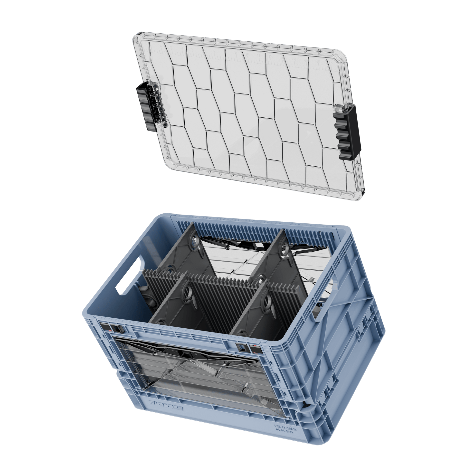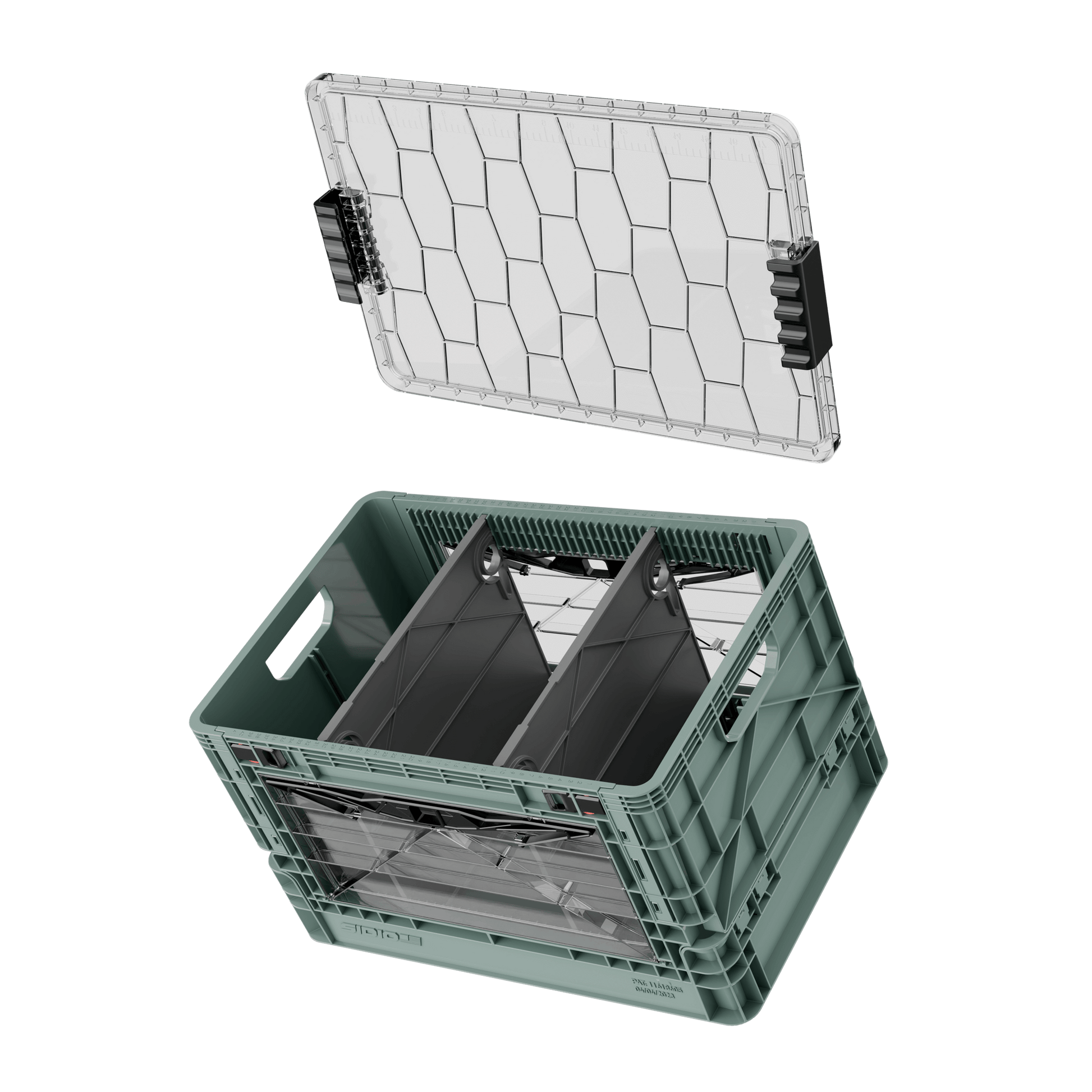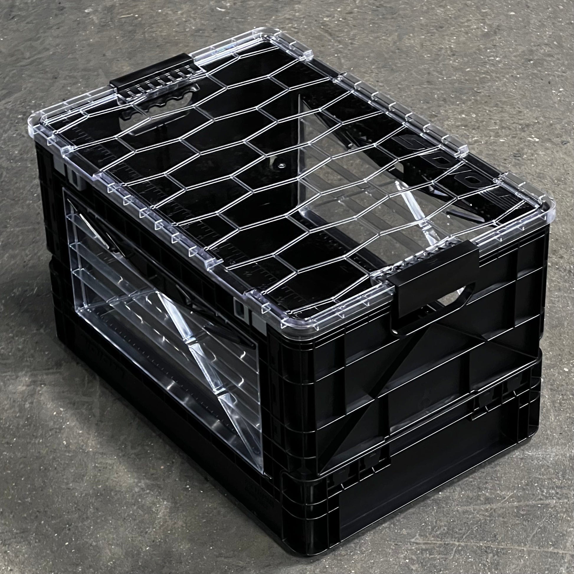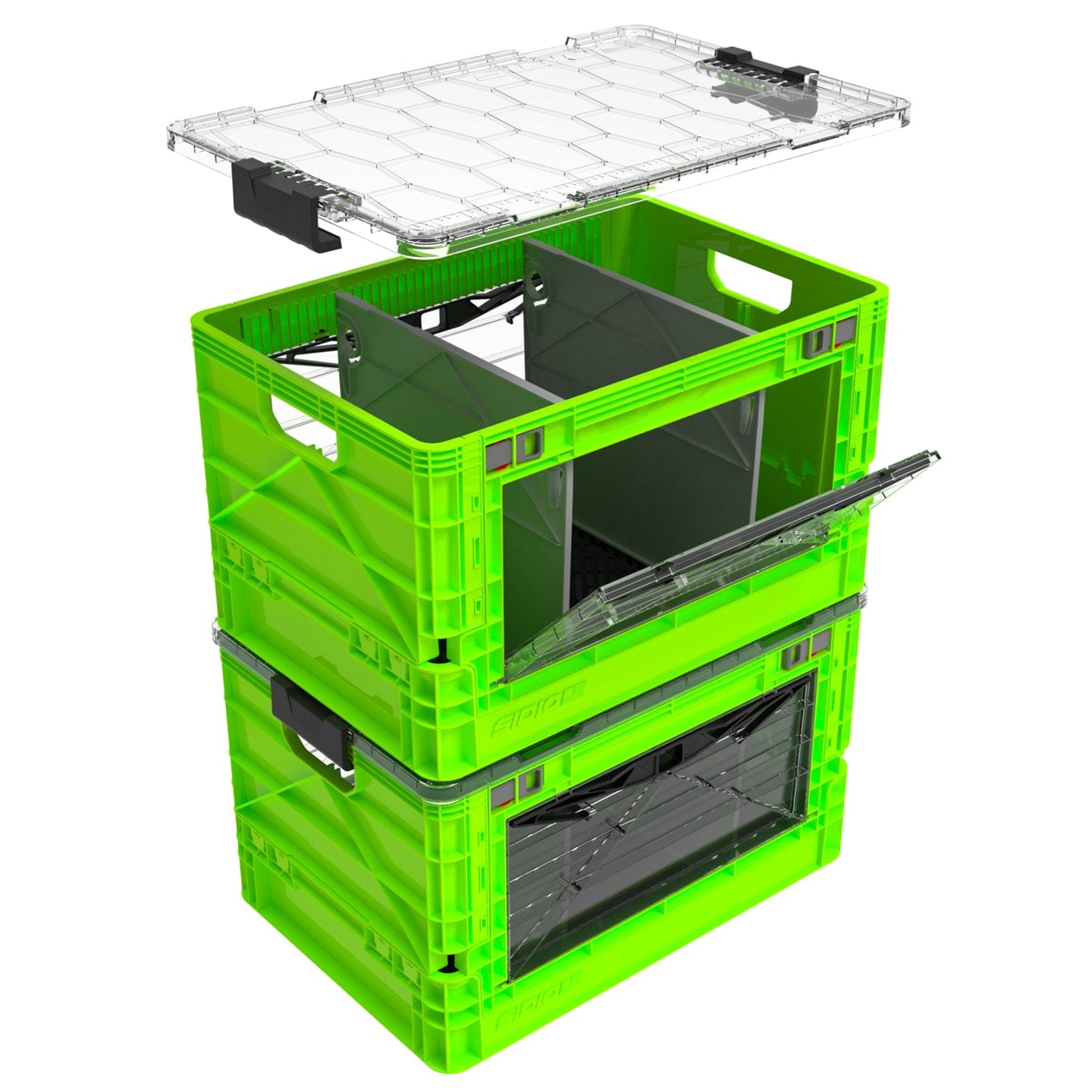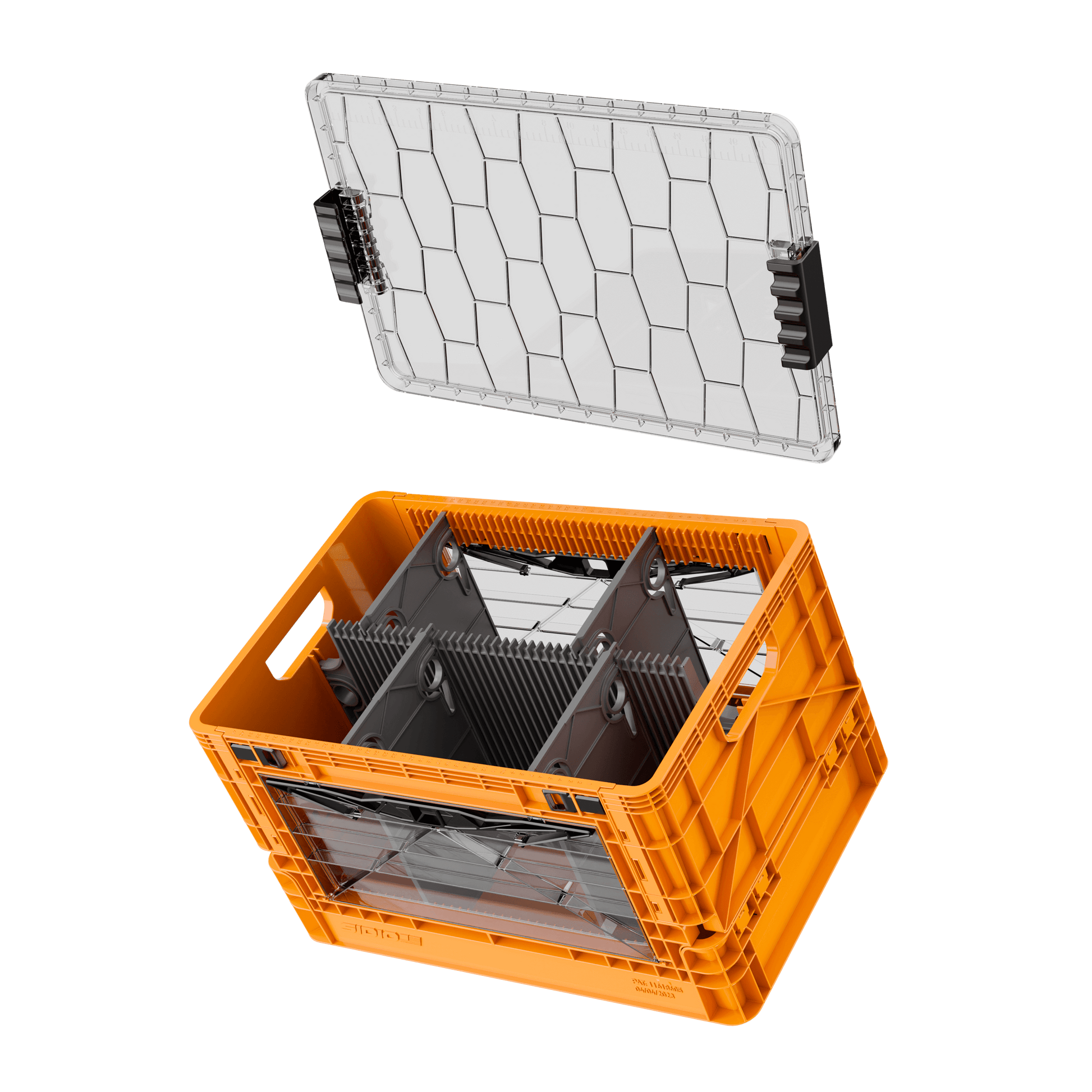 Designed for maximum efficiency and durability, the Full Size Collapsible SidioCrate offers superior storage flexibility. With its collapsible design, reinforced structure capable of supporting over 200lbs, and 41 divider slots, this crate is built for heavy-duty use. The side access window allows for quick retrieval, and it stacks securely with or without the lid, whether collapsed or in use. Made from durable polypropylene block copolymer, it resists cracks, dents, and extreme temperatures, ensuring long-lasting performance. Perfectly stackable with standard 24qt milk crates, it’s the ultimate storage solution for any environment.