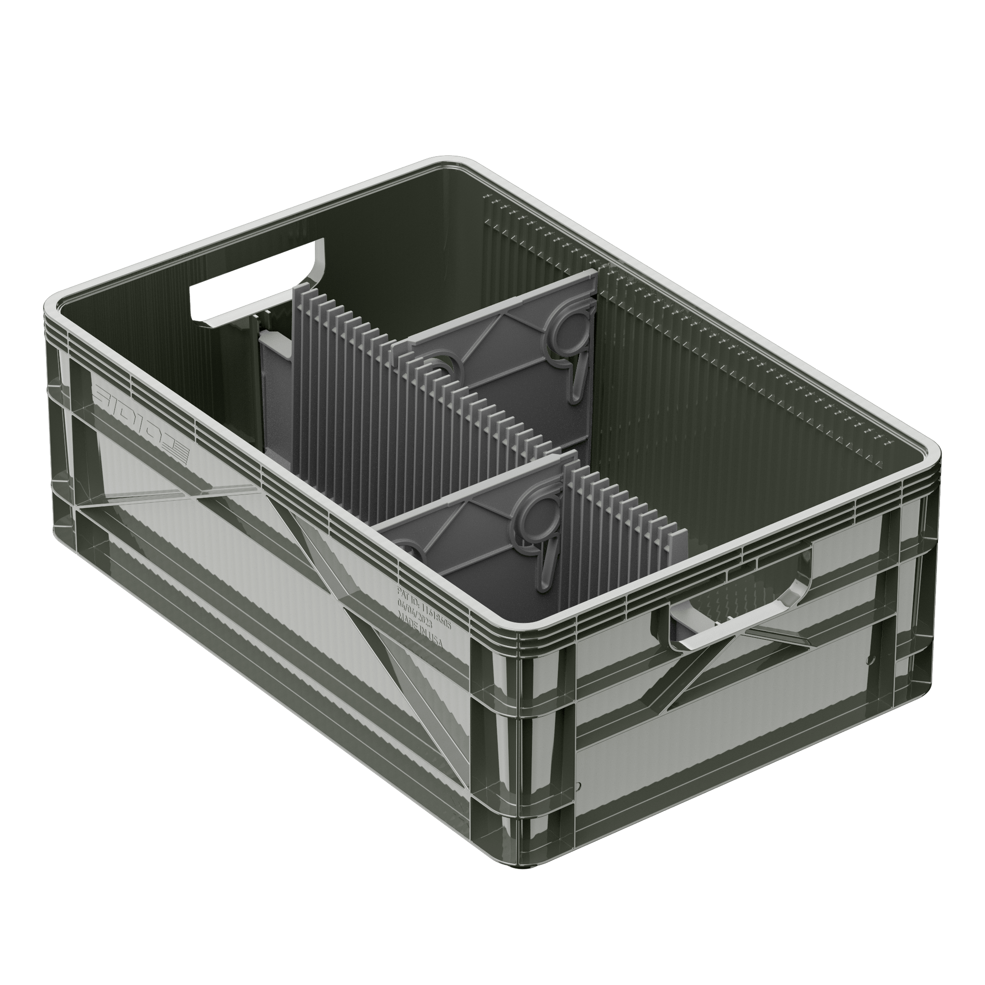 - Stacks with Standard half or full 24qt Milk Crates