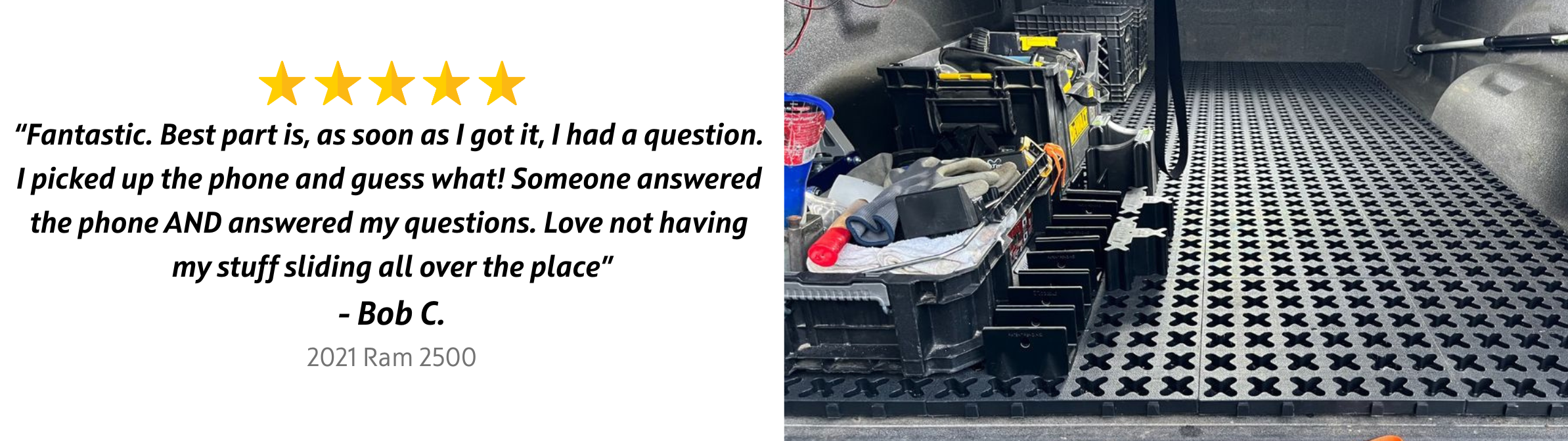 Set up your Ram 2500 for better truck bed organization with this cargo management system. Adjustable blockers plug into the mat in any configuration, creating compartments for tools, gear, and equipment. Built to fit between the wheel wells, it slides toward the tailgate for fast access to cargo. Compatible with drawer systems, bed slides, and other custom setups.