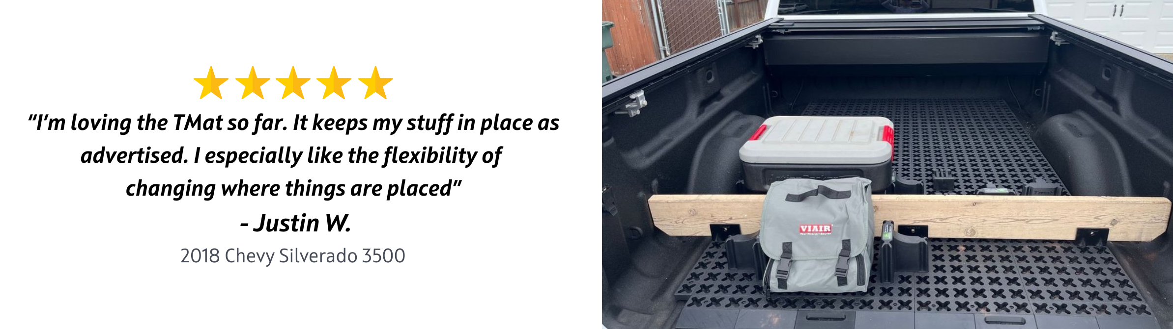 WARNING: Tmat is designed for enclosed and covered cargo areas such as covered truck beds, SUVs, vans, campers, and enclosed trailers. Extra precautions must be taken when used in an open-air cargo area to protect from wind and roll-overs. Tmat should never be used in an open-sided bed or with the tailgate down.